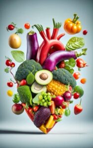 Fruits like pomegranates, grapes, berries, and citrus fruits improve heart function, while vegetables like tomatoes, spinach, and carrots strengthen blood vessels.